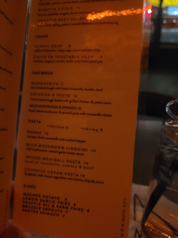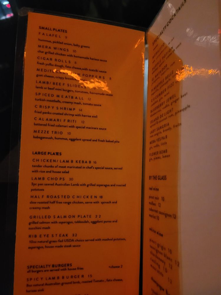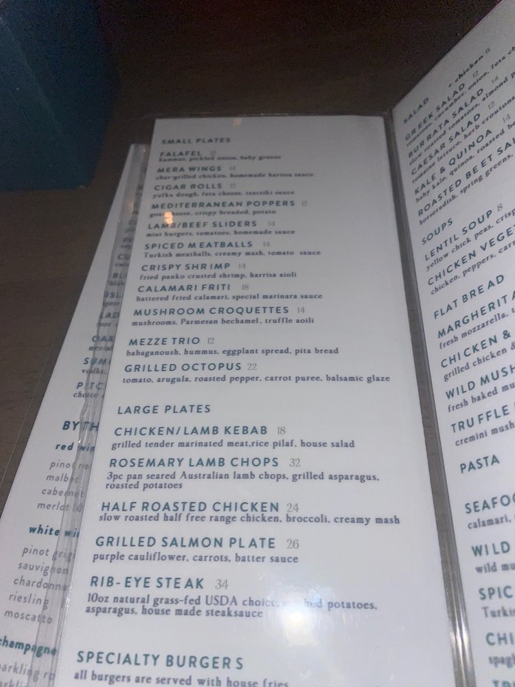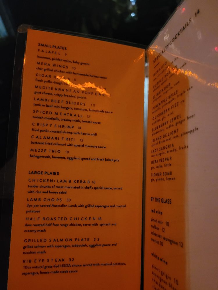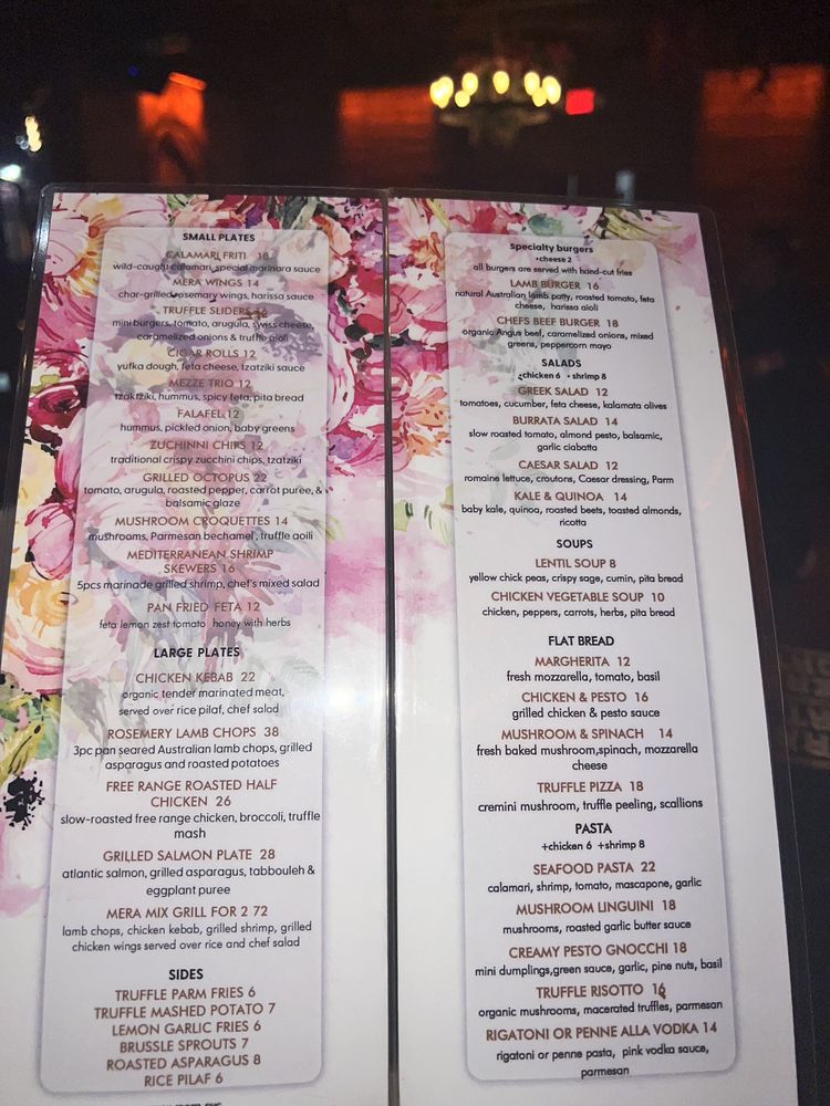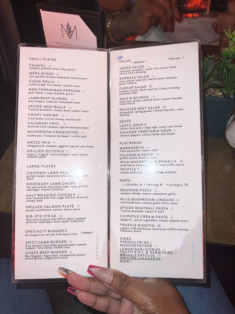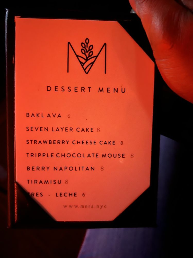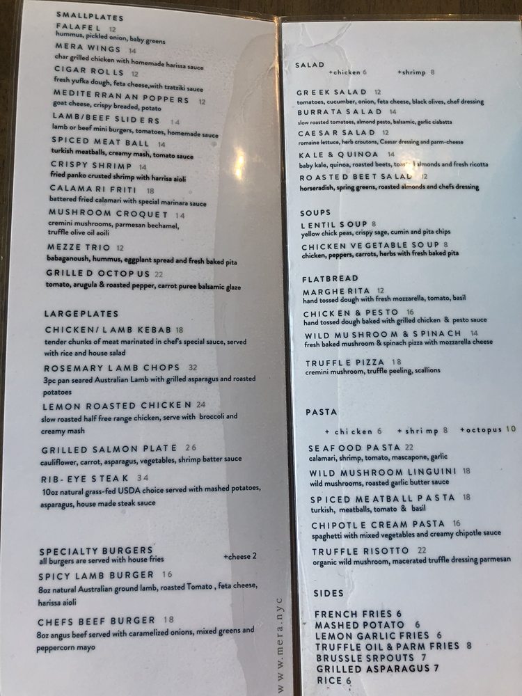 Introducing the menu at Mera, located in Brooklyn, NY, a classy and romantic spot offering a variety of dishes. From appetizer plates like Mushroom Croquet and Mera Wings to flavorful Mera Burgers such as the Spicy Lamb Burger and classic American Cheese Burger, there is something for every palate. Don't miss out on their new Panini Sandwiches, like the Grilled Chicken & Pesto Sauce Panini or Fried Chicken Panini. With happy hour specials, a full bar, and delicious cocktails like the Casa de Mera, Mera is the perfect spot for a night out. Customers rave about the cozy ambiance, friendly service, and tasty dishes, making it a must-visit restaurant in the area. Whether you're looking for a date night spot or a casual hangout, Mera delivers on all fronts.